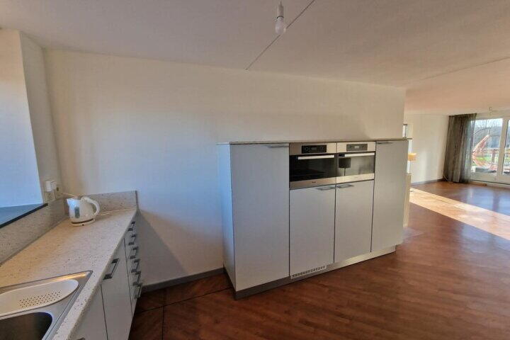overloop, toiletruimte, ruime living met schuifpui naar groot terras op het westen. veel extra lichtinval en vrij uitzicht door het raam in de zijgevel. vaste kast. grote (woon/eet) keuken aan de voorzijde met uitgebreide keukeninrichting voorzien van inbouw apparatuur; gaskookplaat (inclusief wok brander), rvs afzuigschouw, koelkast, vriezer, vaatwasmachine en combi/oven-magnetron.